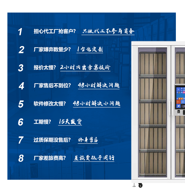 有15年管家式服务中间商的成熟经验。成熟产品有RFID智能柜、称重柜、光敏柜、智能工具车、公检法档案管理柜。支撑软件定制开发。