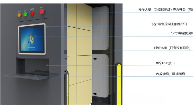 22工控触摸显示屏,配备可收放键盘,方便实时交互输入操作。工控显示屏钥匙开启后可上掀,方便维护。